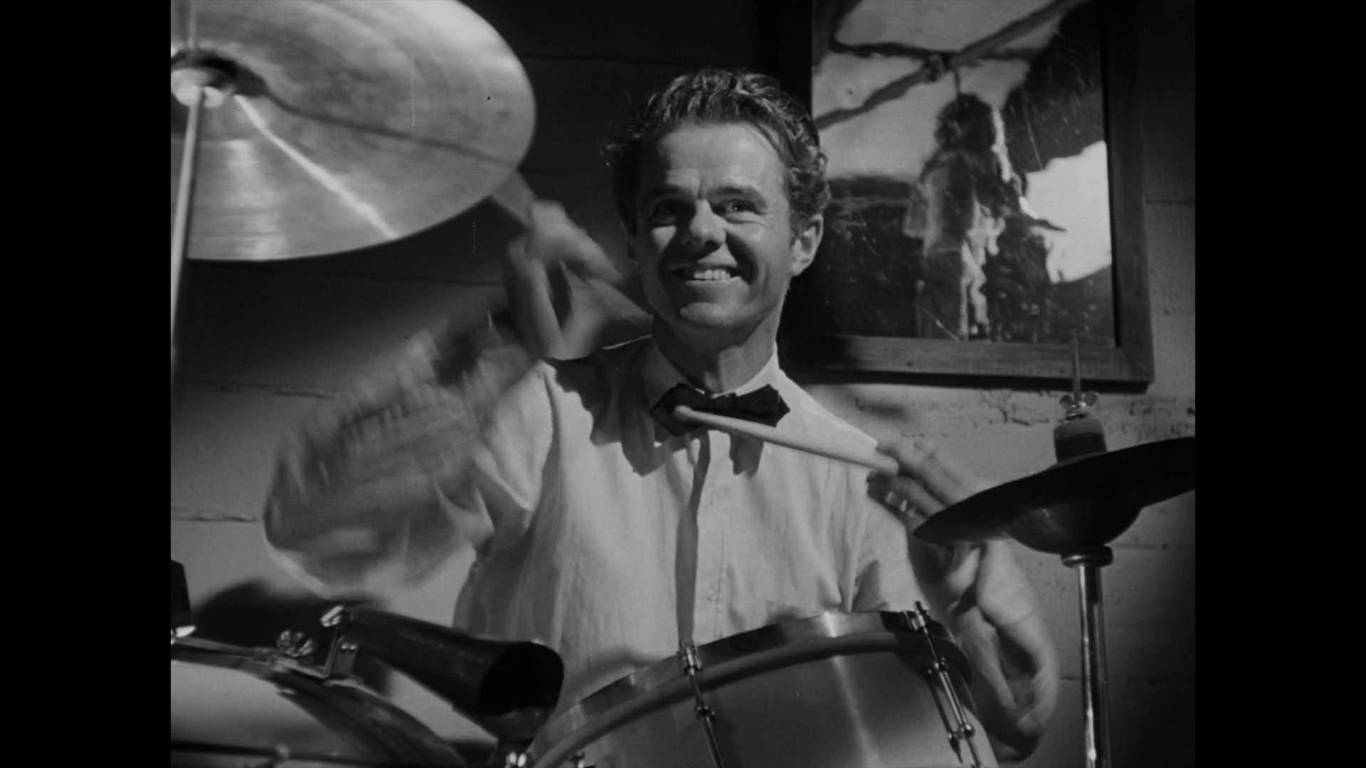 She catches his eye at a big band performance where he plays and, afterwards, allows herself to be led down into an underground storage room where a pack of ratty musicians furiously pump out crazed jazz tunes. In a shockingly erotic moment (for 1944), Carol cheers Cliff on, leering and laughing maniacally, as he wildly performs, with masturbatory intensity, a rapid-fire drum solo. Unfortunately, the film climaxes at this point (no pun intended), and the search for the identity of both the mystery woman and the heinous killer, whose revelation comes far too early, slowly lose their tension until the audience is treated to a predictably saccharine ending.